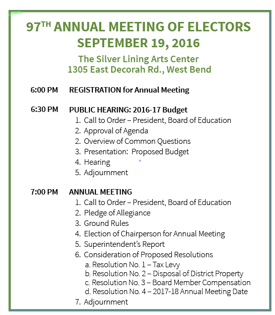 The Board accepted the preliminary budget at the June 13, 2016, Board meeting. The WBSD Annual Meeting will be held on September 19 at The Silver Lining Arts Center. The Board will certify the levy at the October 24 Board meeting.